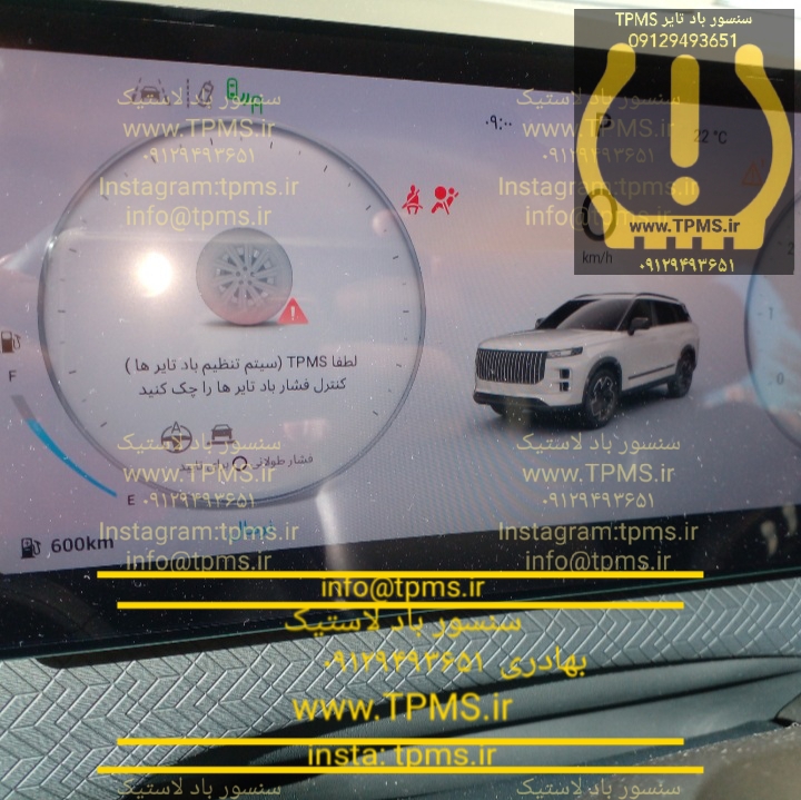در شکل فوق سنسور TPMS تایر عقب راننده اطلاعات چرخ را نمایش نمی دهد. این به معنای خرابی سنسور باد لاستیک آن تایر می باشد. خطای زرد رنگ نعل اسبی TPMS نیز روشن شده است. در صورت خرابی TPMS در هنگام استارت خودرو نیز خطای زیر در پشت آمپر دیده می شود: