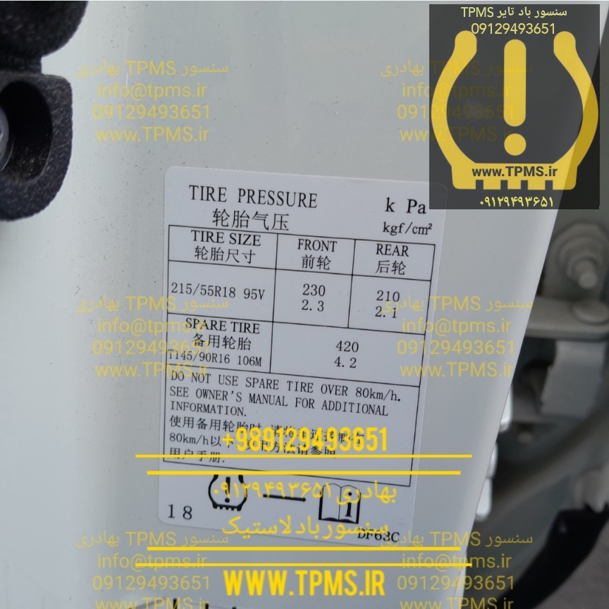 شکل زیر در قسمت TPMS پشت آمپر نیسان قشقایی را نمایش می دهد. طبق استاندارد، لاستیکهای جلو باید 33.5 پی اس آی و لاستیکهای عقب 30.5 پی اس آی باد داشته باشند.